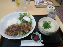 | 今回は夜のサービスメニュー(850円)は、温玉入り豚ステーキ丼と温麺。味が良かった。今回は残業帰りだったのでのんびりできなかったのが残念。(2015/11/2) |